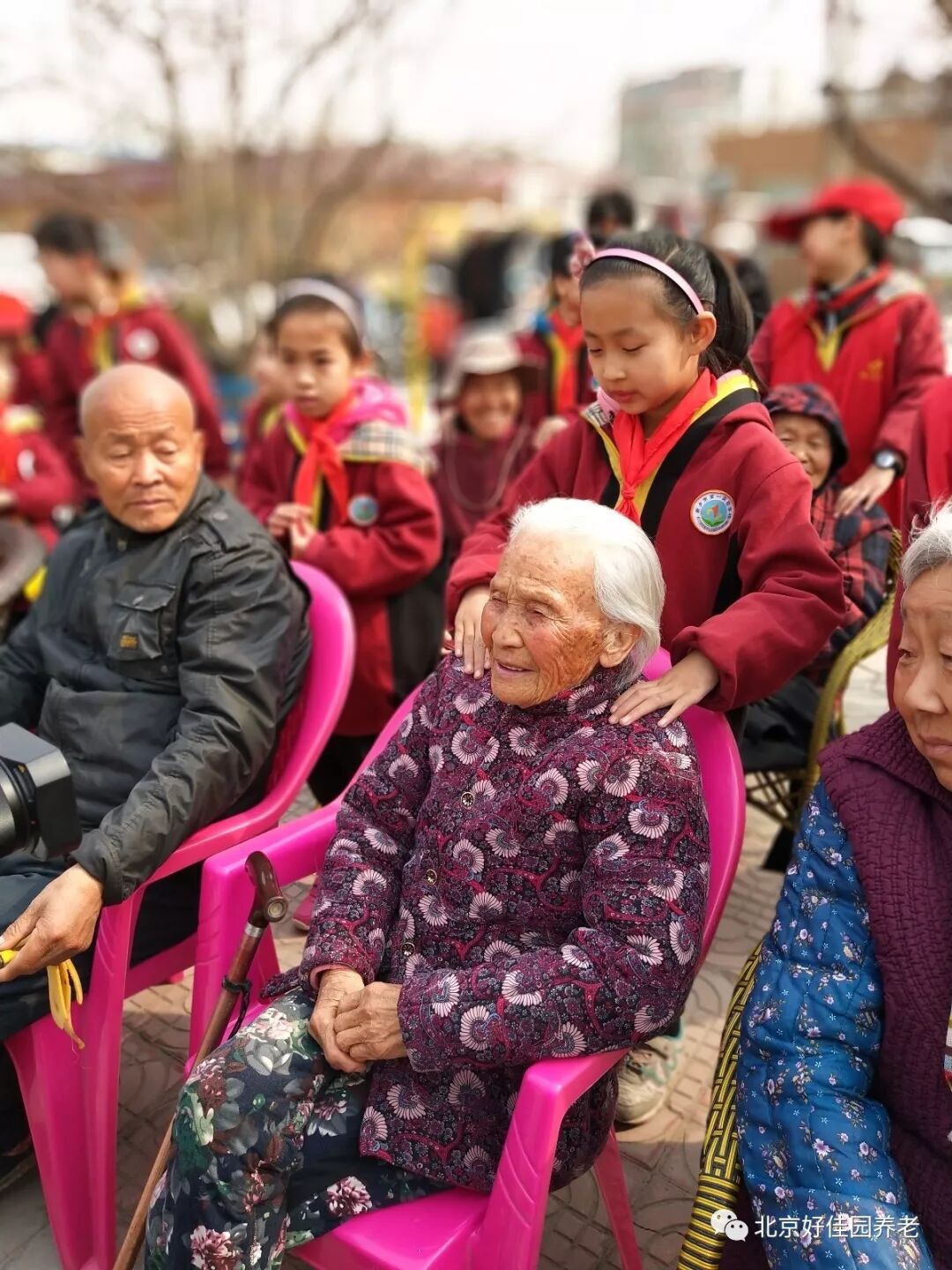 爷爷奶奶们看到这么多天真快乐的孩子,个个高兴地喜笑颜开,情不自禁,入住长者代表李奶奶为孩子们奉上一首《世界是你们的也是我们的》,爷爷奶奶和孩子们欢聚一堂,其乐融融。